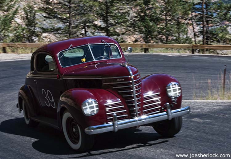 | Here's a great photo of a 1939 Plymouth coupe racing around a curvy uphill bend during Colorado's Hot Rod Hill Climb held last month.