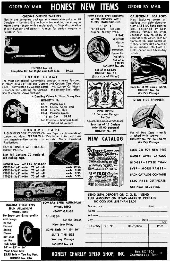 Remembering Honest Charley: Those of us of a certain age remember the small, crowded b/w ads in various 1950s-1960s car buff magazines for Honest Charley's Speed Shop.