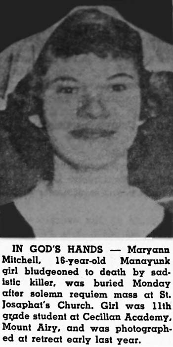 On December 28, 1959, 16 year-old Maryann Mitchell from the Manayunk neighborhood of Philadelphia went missing. Three days later, her body was found in the Montgomery County suburb of Lafayette Hill, PA.