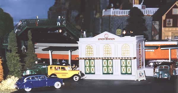 Lionel Hiawatha arrives at Union Station on lower level. Several vehicles (blue Chrysler Airflow, green '38 Cadillac, yellow '35 Ford taxi and '40 Ford woody station wagon) wait to pick up passengers. Note the gawkers watching the activities from the passenger overpass.